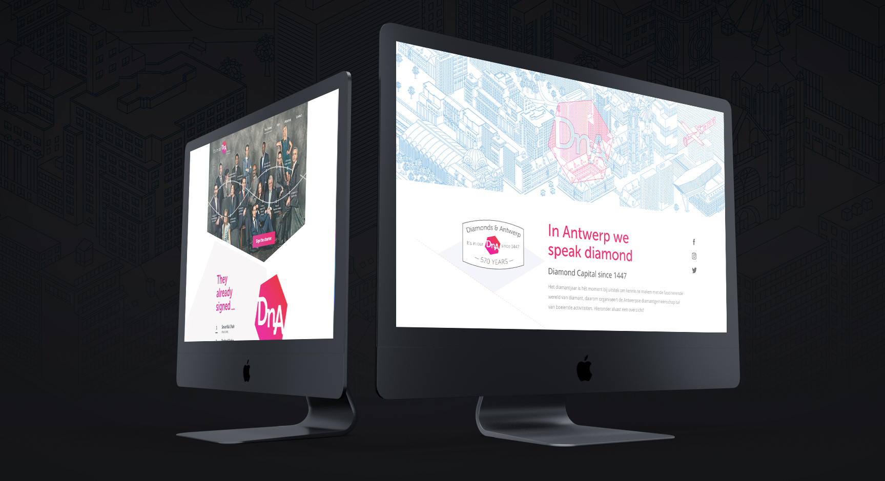 De DnA campagne website weerspiegelt de unieke voordelen en kwaliteiten van de Antwerpse diamantsector en de stad in een Charter. Diamantairs en andere sectorgenoten worden uitgenodigd om deze waarden te ondertekenen om de wereld te tonen waarvoor ‘Diamonds and Antwerp’ staat. Ook voor de Charter pagina werden reeds sterke visuals door AWDC voorzien. Om deze door te trekken, herhaalden we hier ook de verschillende elementen, zoals de schuine lijnen. Zo konden we een relatief eenvoudige website ook mooi weergeven.