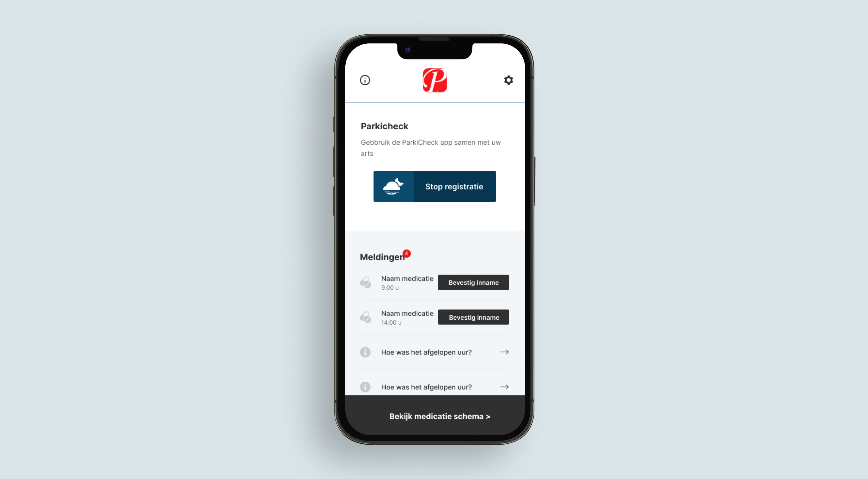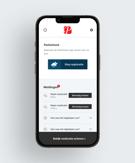 De applicatie houdt niet enkel de belevingen van de app-houder bij, maar het ondersteunt ook bij het op tijd innemen van medicatie. De behandelend arts kan per patiënt een medicatieschema op maat toevoegen. ParkiCheck geeft pushmeldingen door wanneer het tijd is om de medicatie in te nemen.