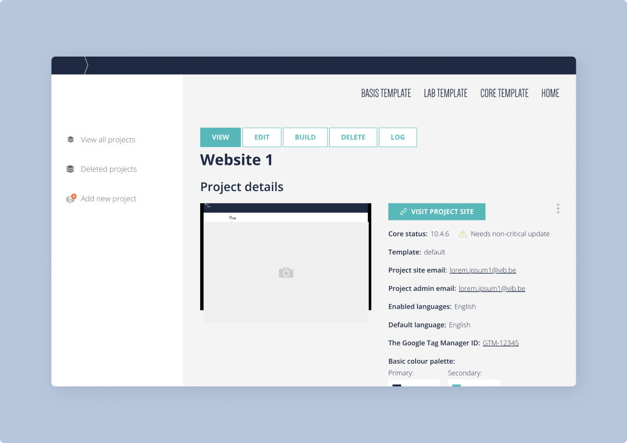 Voor de detailpagina’s van de website is er een projectverantwoordelijke, die snel toegang heeft tot verschillende editing mogelijkheden: kleurinstellingen die dynamisch aangepast kunnen worden voor de website, de taalswitch voor meertalige sites, updates over issues of benodigde updates,....